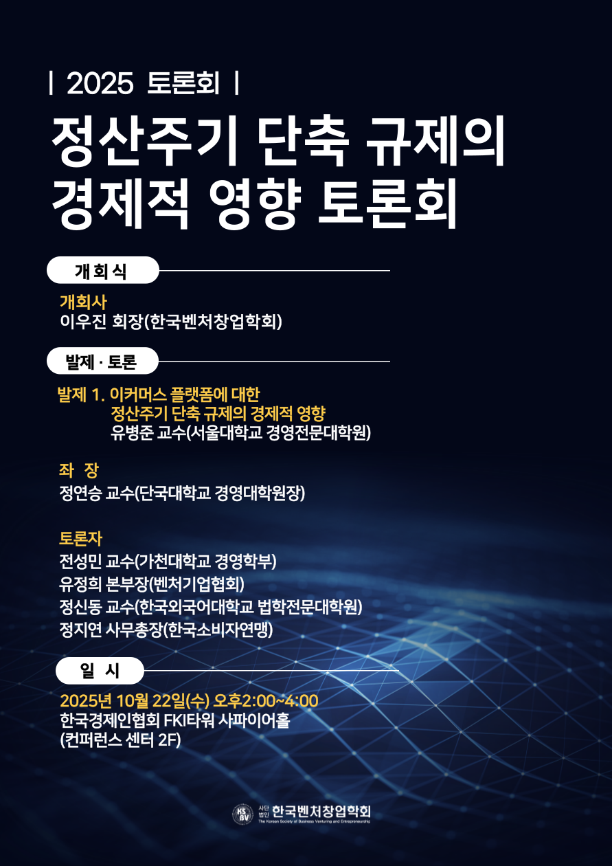 ㅈ □ 추진배경 ○ 최근 일부 온라인 이커머스 플랫폼의 부도 및 회생 신청 사태가 발생하면서, 플랫폼과 파트너로 계약을 맺은 입점업체 및 납품업체, 특히 영세 소상공인들을 보호해야 한다는 사회적 목소리가 커지고 있다. 이러한 사회적 요구에 부응하여 정부는 대규모유 통업법 개정 논의를 통해 법정 정산 주기를 단축하는 방안을 적극적으로 추진하고 있음 ○ 다만 일률적으로 정산주기를 단축하는 것은 예상치 못한 부작용을 초래할 수 있다는 우려가 있으며, 특히 직매입거래에서 중소 납품업체와 소비자에게 미치는 영향이 크다는 전문가들의 의견이 제기되고 있음. 이번 토론회는 정산주기 규제의 경제적 영향을 분석하고, 객관적인 분석을 바탕으로 해당 분야 전문가들의 의견을 청취하여 올바른 정산주기 정책 추진 방향을 모색하기 위함임. □ 개요(안) ○ 일 시 : 2025년 10월 22일(수) 14:00~16:00 ○ 장 소 : 한국경제인협회 FKI타워 사파이어홀(컨퍼런스 센터 2F) ○ 주 최 : 한국벤처창업학회