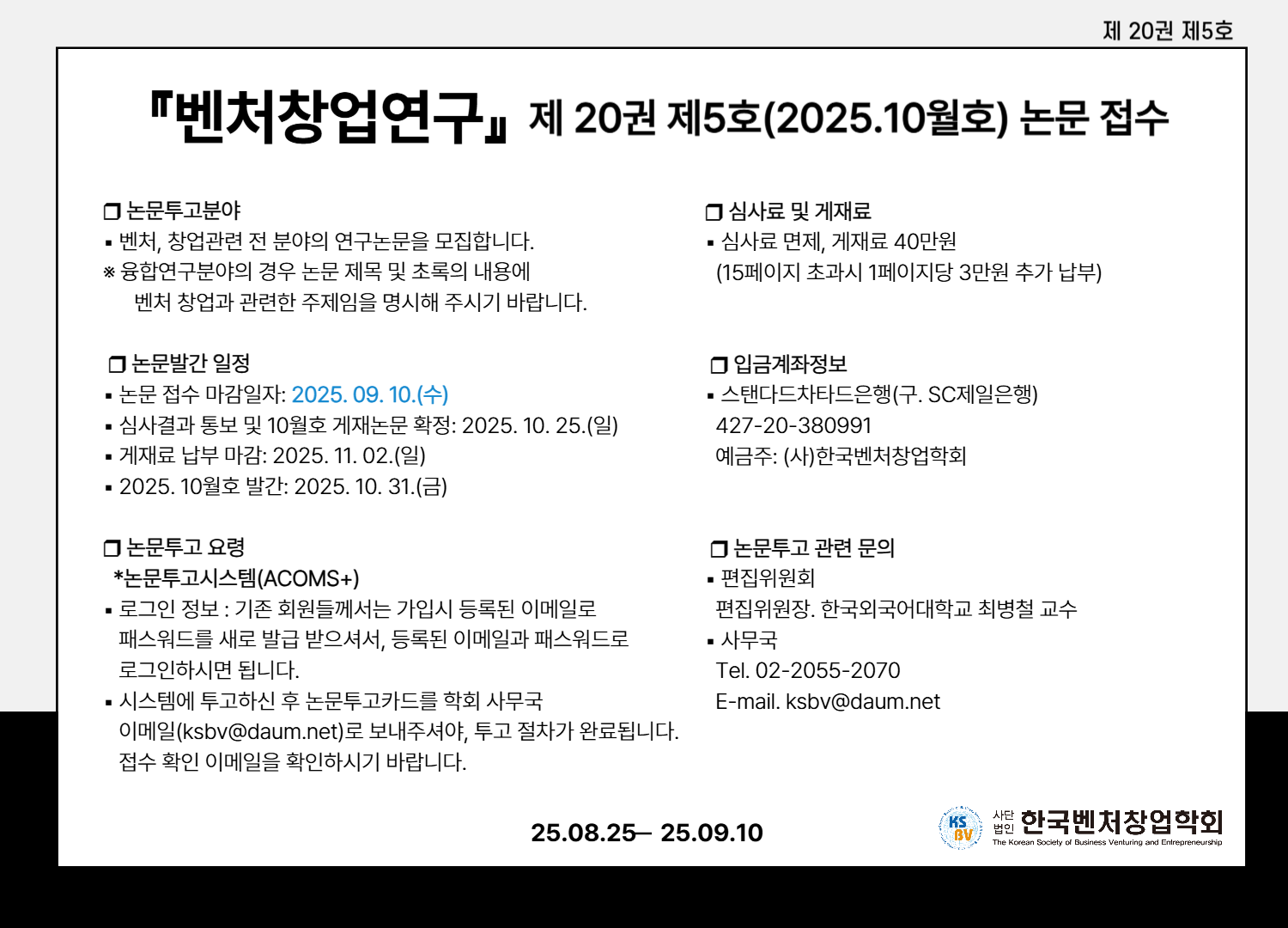 벤처창업연구 제20권 제5호 (2025.10월호) 통권 101호 신규 논문 접수를 시작하였습니다.