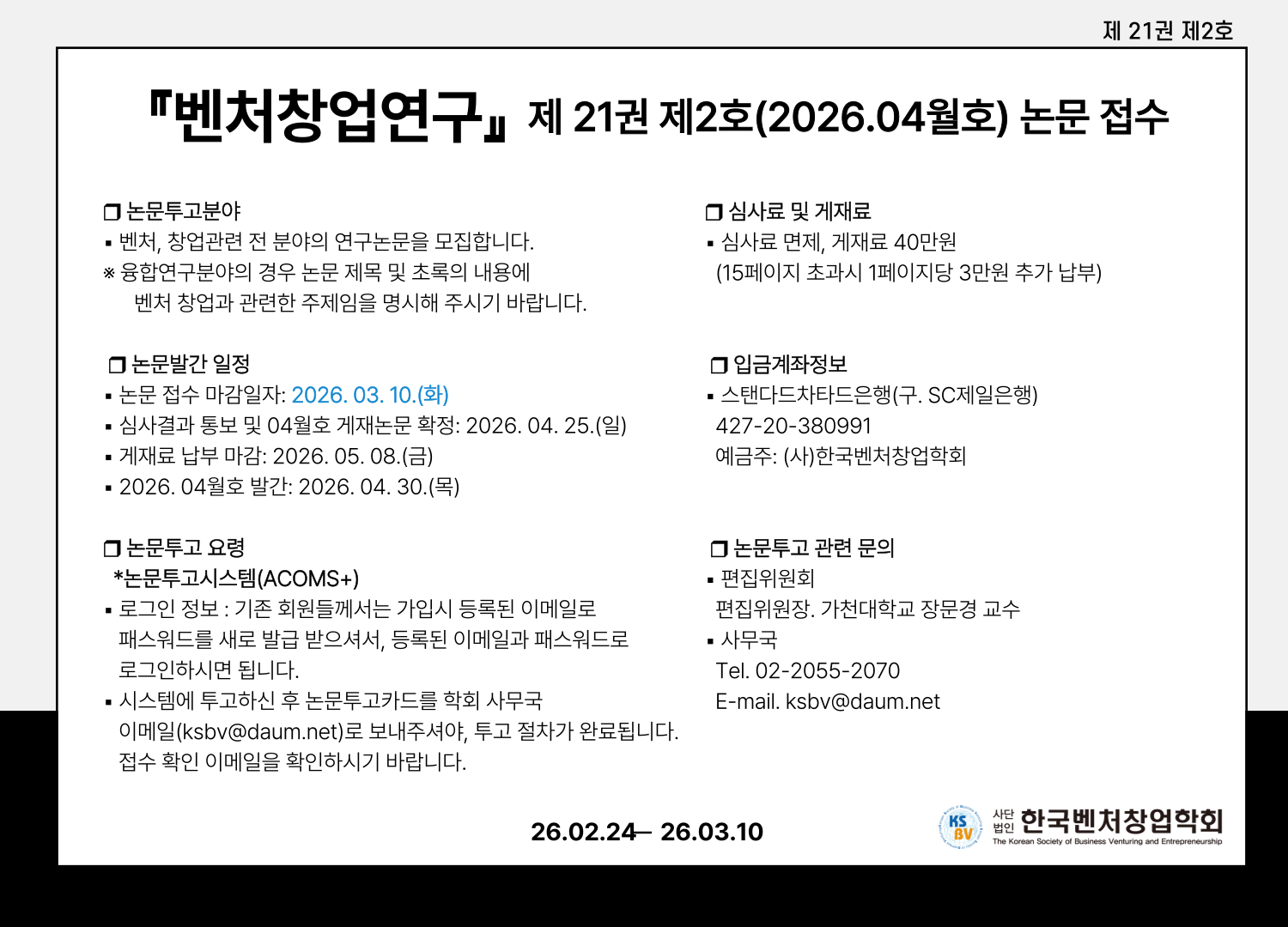 벤처창업연구 제21권 제02호 (2026.04월호) 통권 103호 신규 논문 접수를 시작하였습니다.